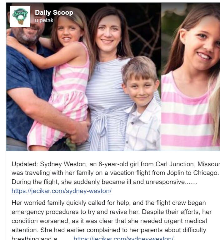 Učenica osnovne škole Sidni Veston (8) bila je na putu za Čikago sa svojom porodicom kada se iznenada razbolela, a zatim nije davala znake života nakon što je u četvrtak poletela iz Džoplina u državi Misuri na letu “5121 SkiVest”.