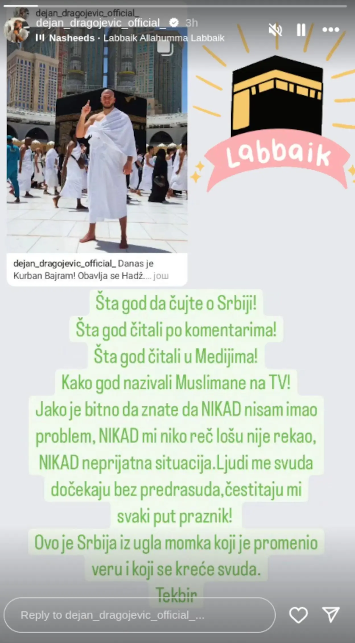 – Šta god da čujete o Srbiji! Šta god čitali po komentarima i medijima! Kako god nazivali muslimane na TV! Jako je bitno da znate da nikad nisam imao problem, nikad mi niko riječ lošu nije rekao, nikad neprijatna situacija. Ljudi me svuda dočekuju bez predrasuda, čestitaju mi svaki put praznik! Ovo je Srbija iz ugla momka koji je promenio veru i koji se kreće svuda. Tekbir – glasilo je u objavi Dejana Dragojevića.