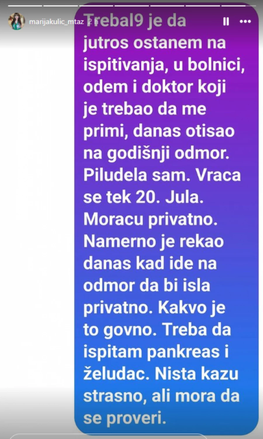 – Trebalo je da jutros ostanem na ispitivanju, u bolnici, odem i doktor koji je trebao da me primi, danas otišao na godišnji odmor. Poludela sam. Vraća se tak 20. jula. Moraću da idem privatno! Namerno je rekao danas kad ide na odmor da bi išla privatno. Kakvo je to g*vno! Treba da se ispita pankreas i želudac! Ništa strašno, kažu, ali mora da se proveri – napisala je Marija na Instagram profilu.