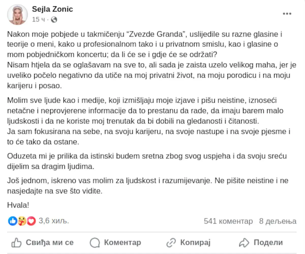Šejla je još jednom zamolila sve da ne šire dezinformacije i naglasila da zbog ovakvih situacija ne može da se raduje pobedi koju je ostvarila u “Zvezdama Granda”.