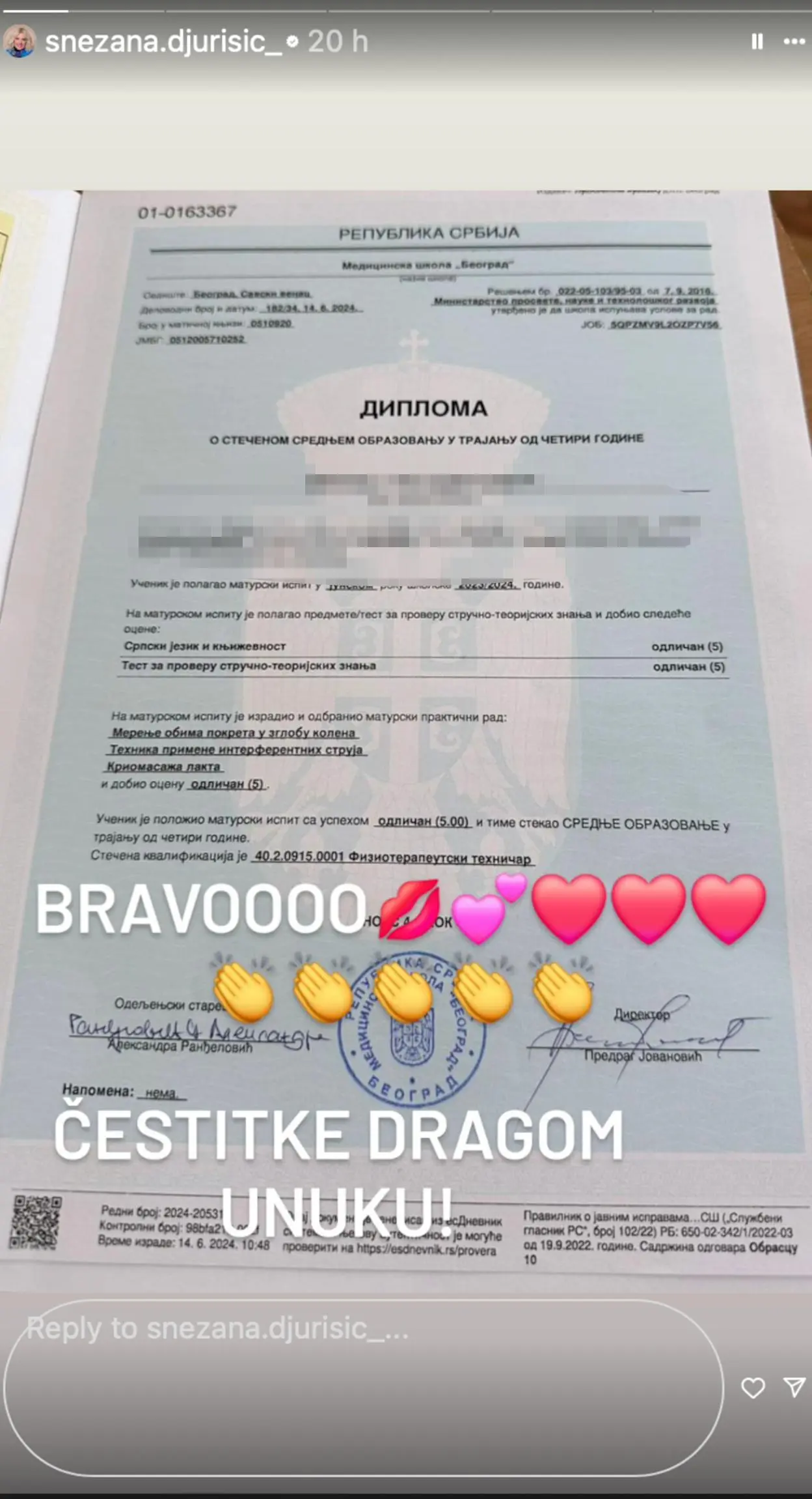 – Bravo! Čestitke dragom unuku – napisala je ona priloživši fotografiju svedočanstva o završenoj srednjoj školi i položenom maturskom ispitu sa odličnim uspehom.