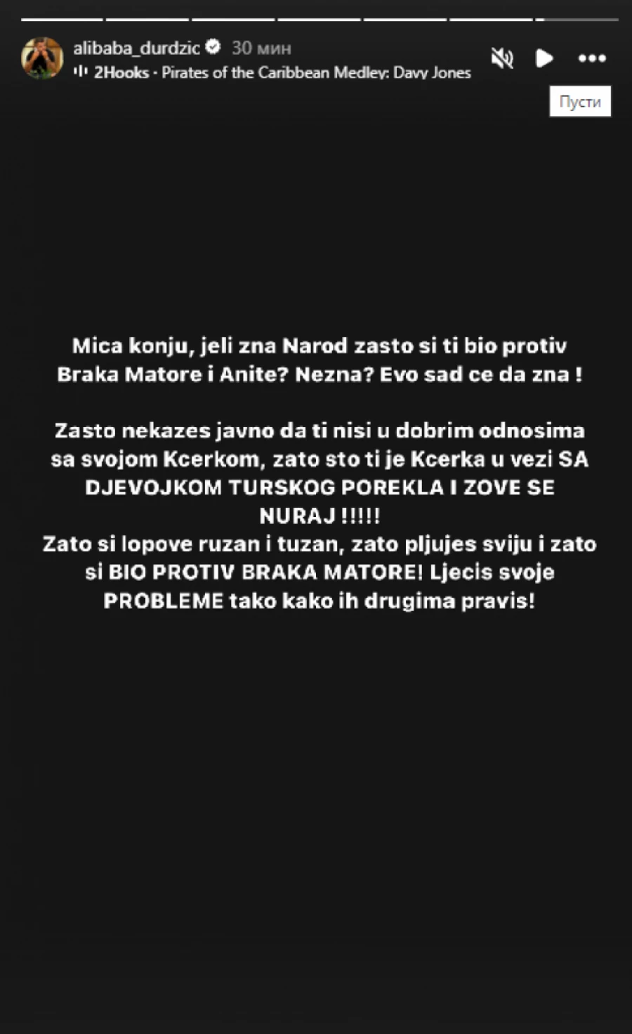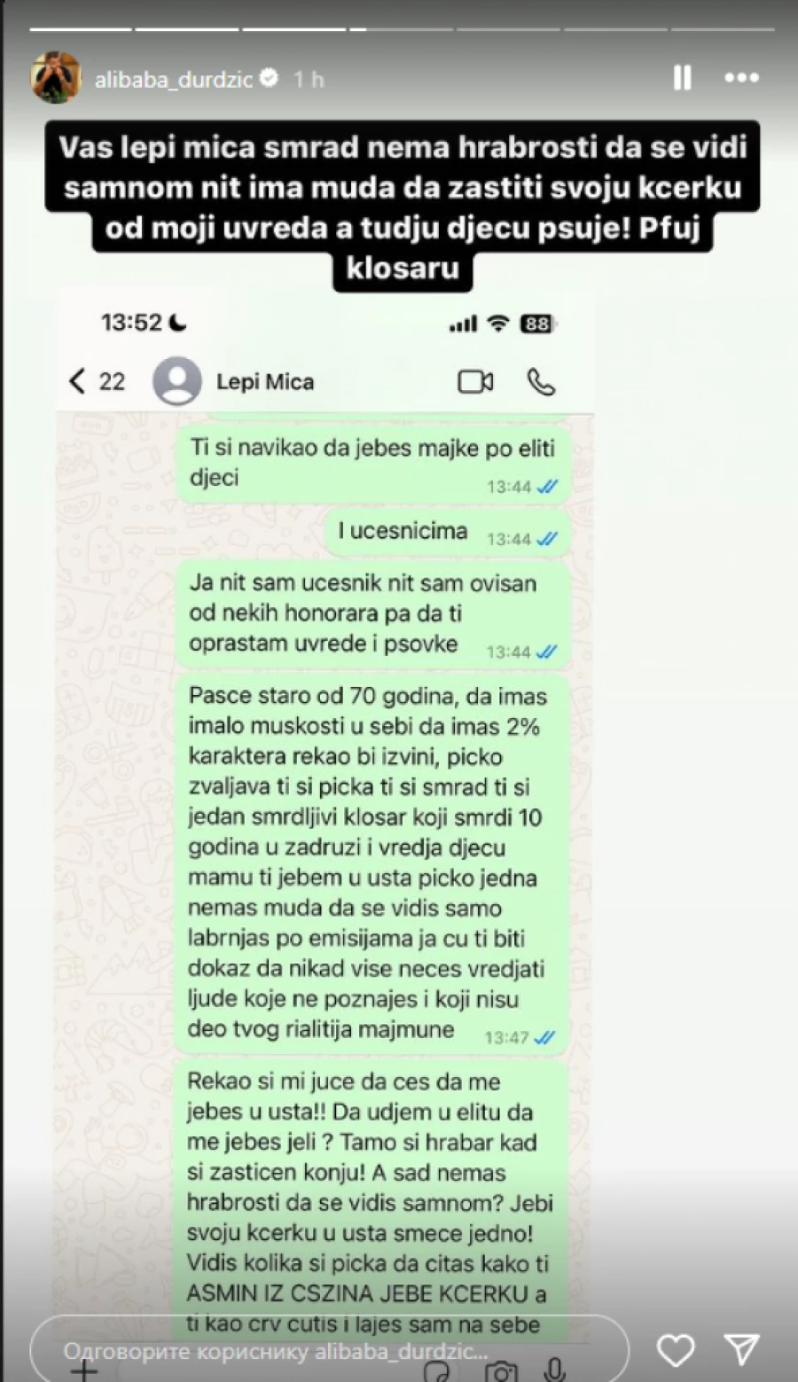 – Lepi Mića se u*akio i naravno da više ne diže telefon. Eno ga sedi u policiji i prijavljuje me. To je vaš smrdljivi Lepi Mića koji ima mu*a kao ptica, a uši kao slon. Ali ovo se neće završiti na ovome – poručio je Durdžić.