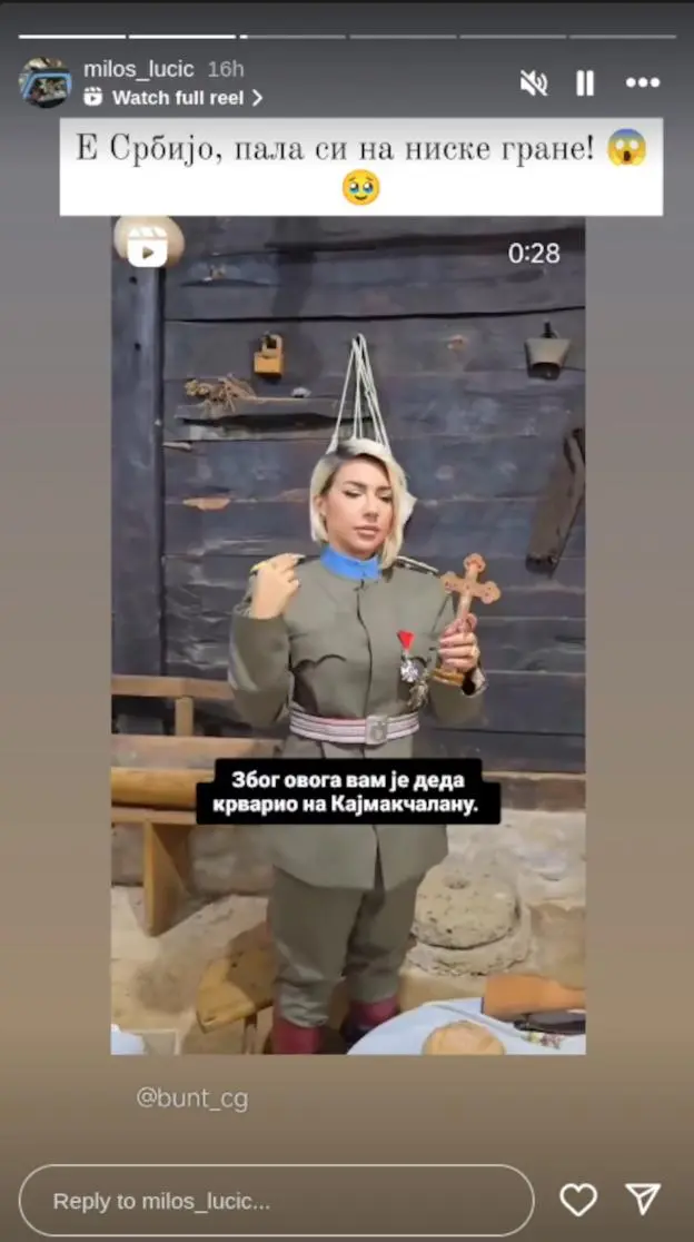 Naime, otac Miloš je na svom Instagram profilu podelio snimak koji je Jovana objavila na društvenim mrežama. Na snimku se vidi kako Jovana nosi uniformu vojvode Živojina Mišića, držeći časni krst i pogaču.