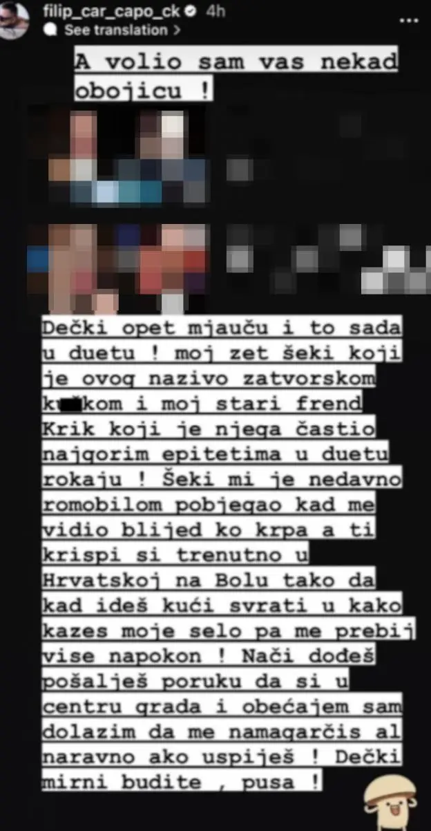 – Momci opet mjauču i to sada u duetu! Moj zet Šeki koji je ovog nazivao zatvorskom k*čkom i moj stari prijatelj Krik koji je njega častio najgorim epitetima u duetu rokaju! Šeki mi je nedavno romobilom pobegao kad me je video, bled kako krpa, a ti krispi si trenutno u Hrvatskoj na Bolu tako da kad ideš kući svrati u, kako kažeš, moje selo, pa me prebij napokon! Znači, dođeš, pošalješ poruku da si u centru grada i obećavam da dolazim da me namagarčiš, ali naravno, ako uspeš. Momci, mirni budite, poljubac – poručio im je bivši zadrugar i još kratko dodao: