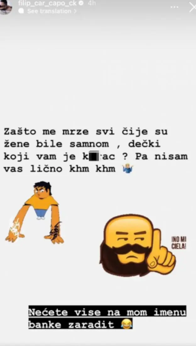 – Zašto me mrze svi čije su žene bile sa mnom? Momci, koji vam je…? Pa nisam vas lično khm khm. Nećete više na mom imenu banku zaraditi – istakao je Filip, a onda se obratio direktno Kristijanu i Dejanu.