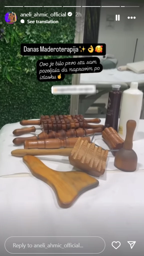 – Danas maderoterapija – napisala je Aneli u opisu Instagram priče u kojoj je snimila oklagije i ostale rekvizite da tretiranje celulita, pa dodala: