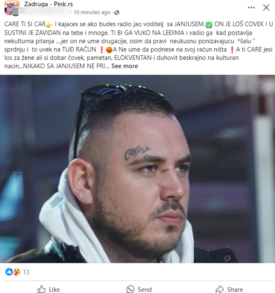 – Care, ti si car! I kajaćeš se ako budes radio kao voditelj sa Janjušem! On je loš čovek i u suštini je zavidan na tebe i mnoge. Ti bi ga vukao na leđima i vadio ga kad postavlja nekulturna pitanja jer on ne ume drugačije, osim da pravi neukusnu ponižavajuću “šalu” – sprdnju i to uvek na tuđ račun! A ne ume da podnese na svoj račun ništa! A ti Care jesi loš za žene ali si dobar čovek, pametan, elokventan i duhovit beskrajno na kulturan način… Nikako sa Janjušem ne pristaj! A on i ne može sam! Sad kad vidi da Uroš mali neće ti mu služis za “potkusurivanje”! A da hoće Uroš, ne bi ni čuo za tebe… da bi on dominirao nad urošem uopšte! Ostani car – stoji u opisu na društvenoj mreži Fejsbuk, na stranici koja se bavi popularnim rijalitijem.