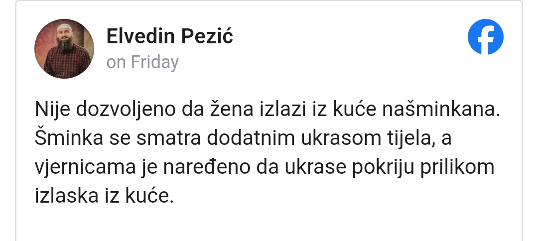“Nije dozvoljeno da žena izlazi iz kuće našminkana. Šminka se smatra dodatnim ukrasom tijela, a vjernicama je naređeno da ukrase pokriju prilikom izlaska iz kuće.” – izjavio je Elvedin Pezić.