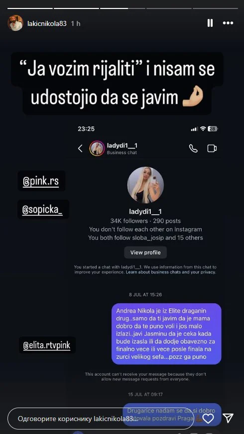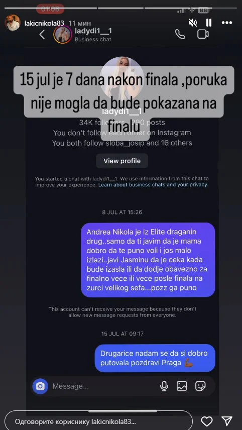 Naime, on je obelodanio čet sa Lejdi, gde jasno možemo videti da joj je poslao poruku nakon superfinala. Međutim, njen odgovor je izostao.
