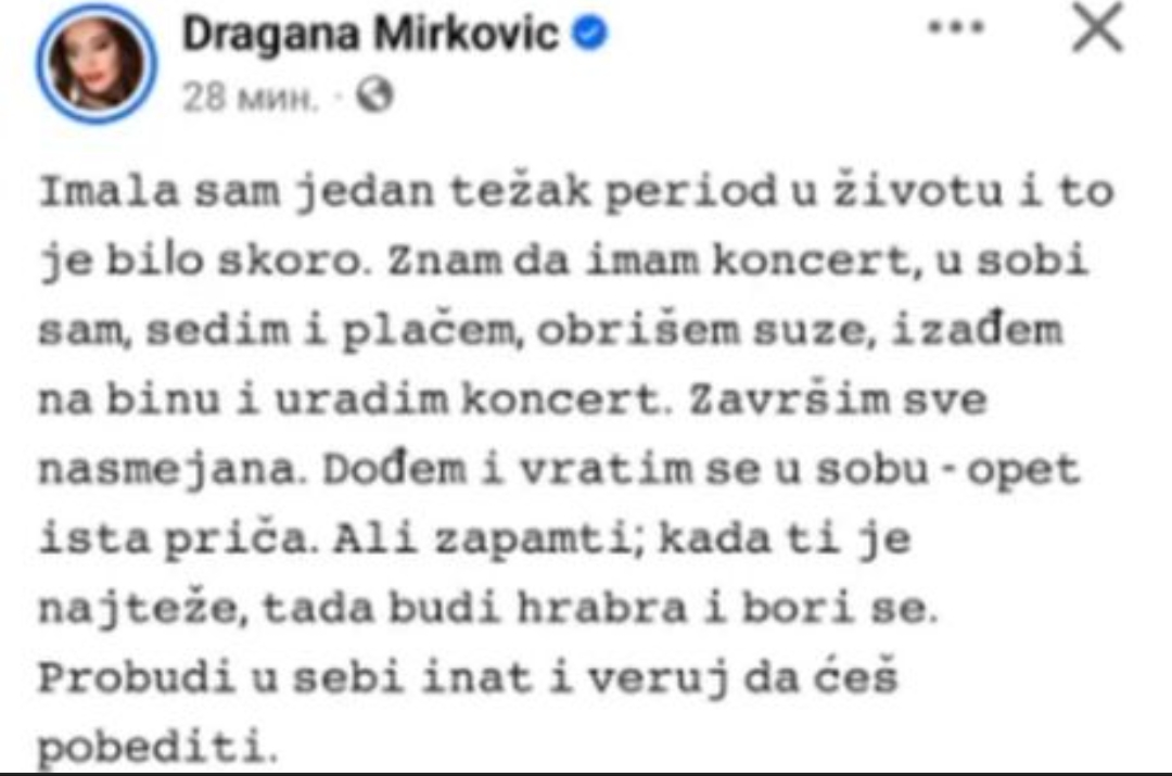 – Imala sam jedan težak period u životu i to je bilo skoro. Znam da imam koncert, u sobi sam, sedim i plačem, obrišem suze, izađem na binu i uradim koncert. Završim sve nasmejana. Dođem i vratim se u sobu – opet ista priča. Ali zapamti, kada ti je najteže, tada budi hrabra i bori se. Probudi u sebi inat i veruj da ćeš pobediti – napisala je Dragana nedavno na svom Fejsbuk nalogu, dok je ova objava malo potom bila obrisana sa profila pevačice.