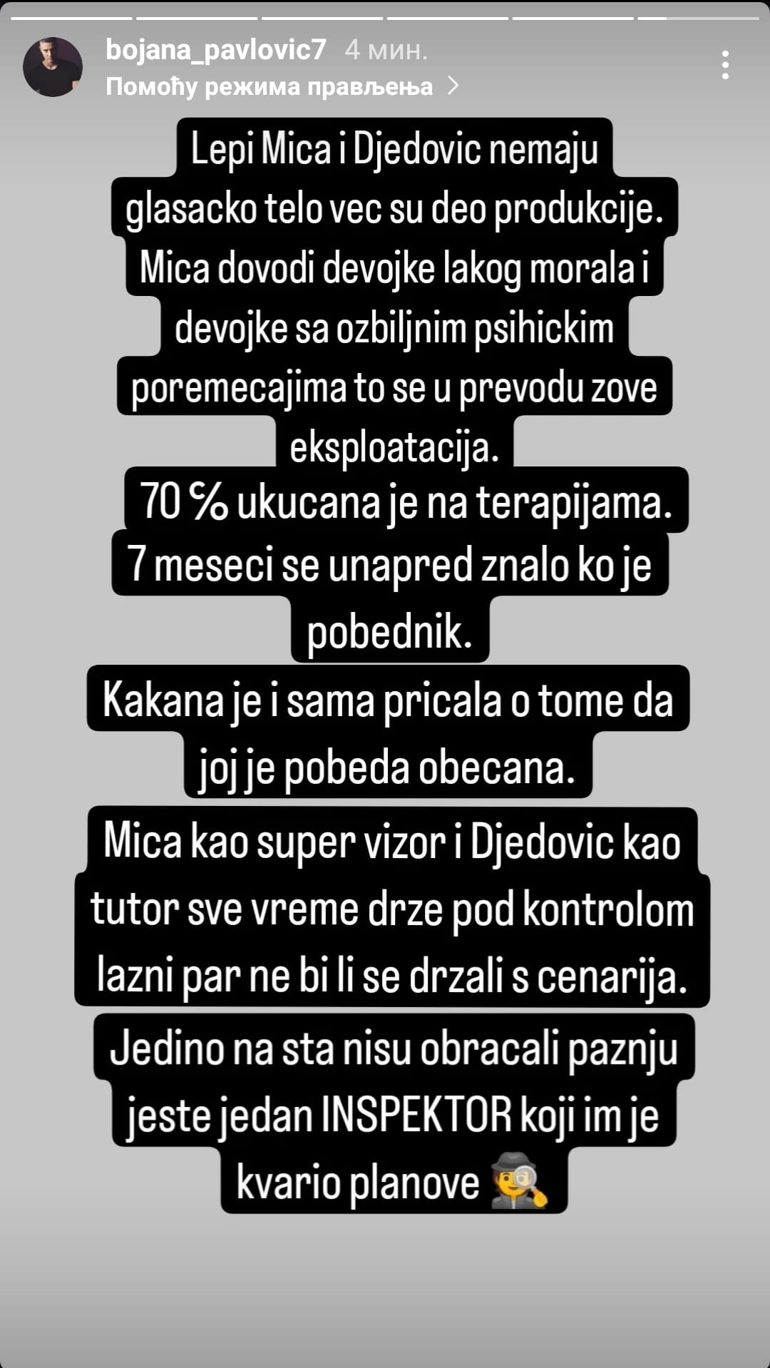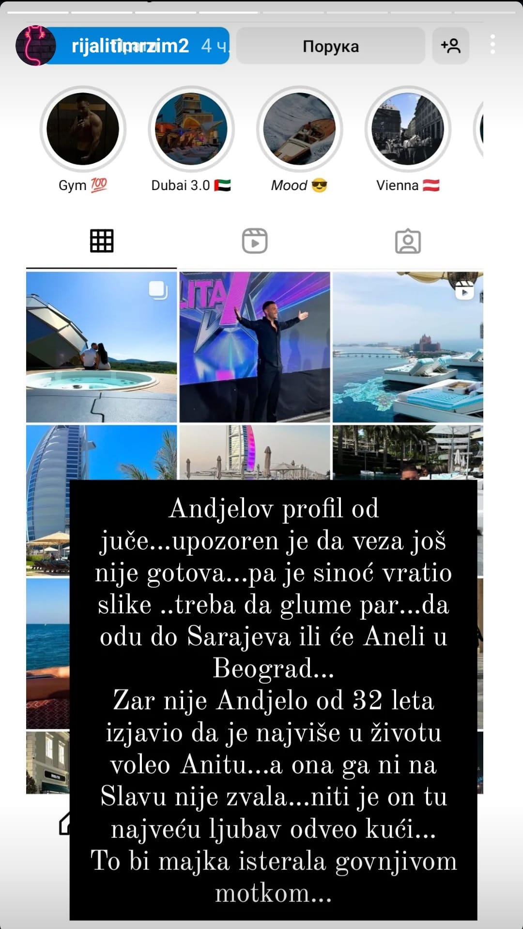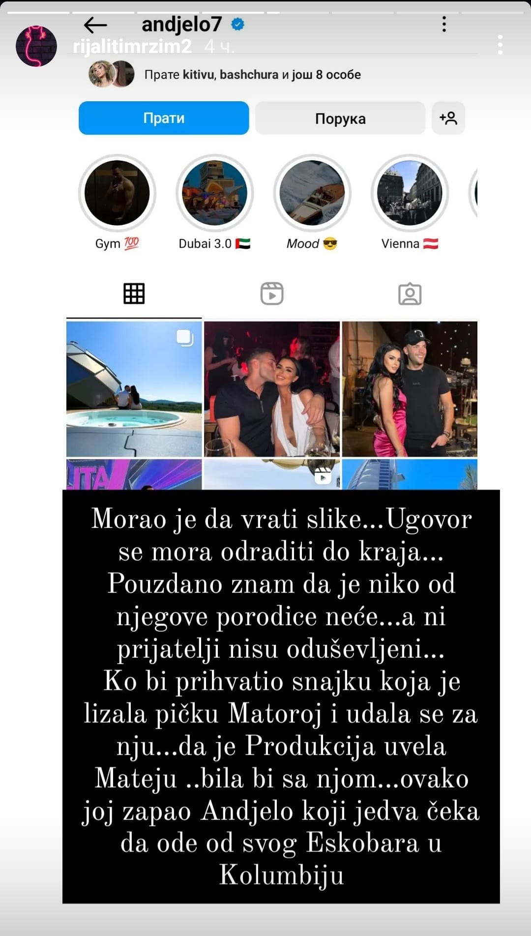Sada se pojavila informacija da je Anđelo bio uklonio fotografije sa Anitom sa instagrama ali da ih je vratio po naređenju produkcije i da mora nastaviti glumiti ljubav.