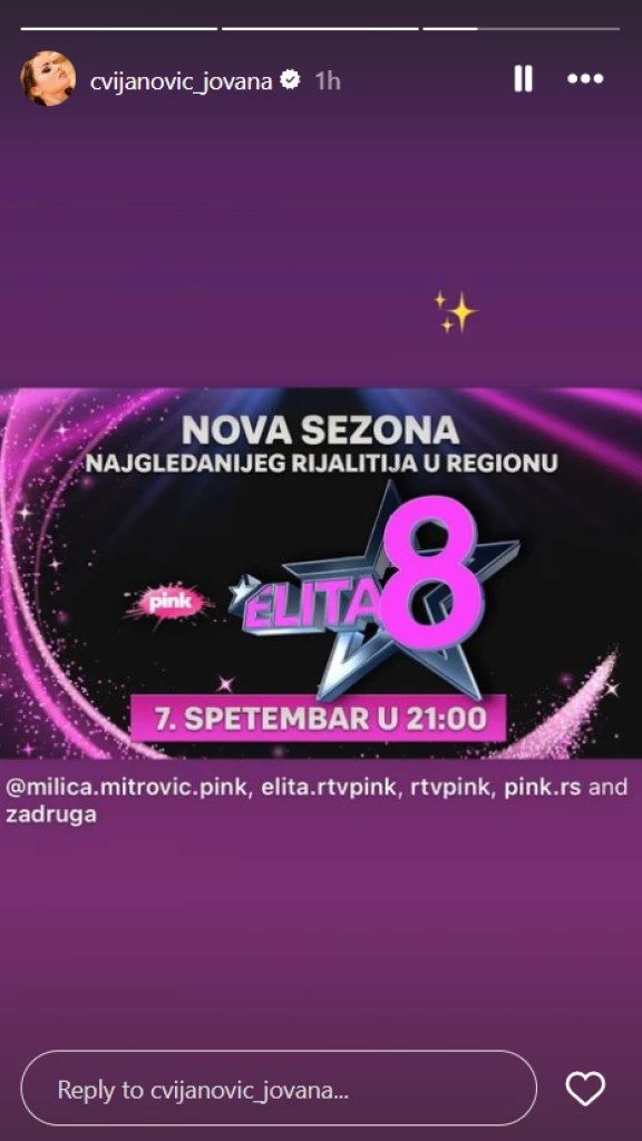 Nakon što je danas Milica Mitrović objavila da “Elita 8” startuje 7. septembra Cvijanovićeva je podelila ovu informaciju i u svojoj Instagram priči iz čega su mnogi zaključili da na taj način najavljuje svoje učešće u osmici.