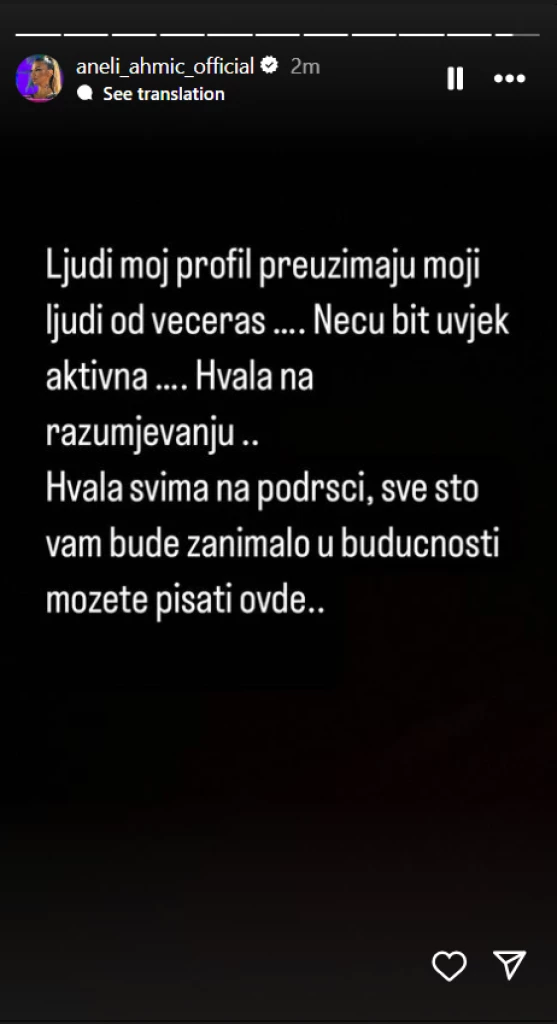 Naime, ona se oglasila na svom Instagram profilu i odjavila se sa ove društvene mreže, jer će ubuduće, kako je istakla, njen nalog preuzeti drugi, koji će ga voditi dok ona ne bude bila u mogućnosti.