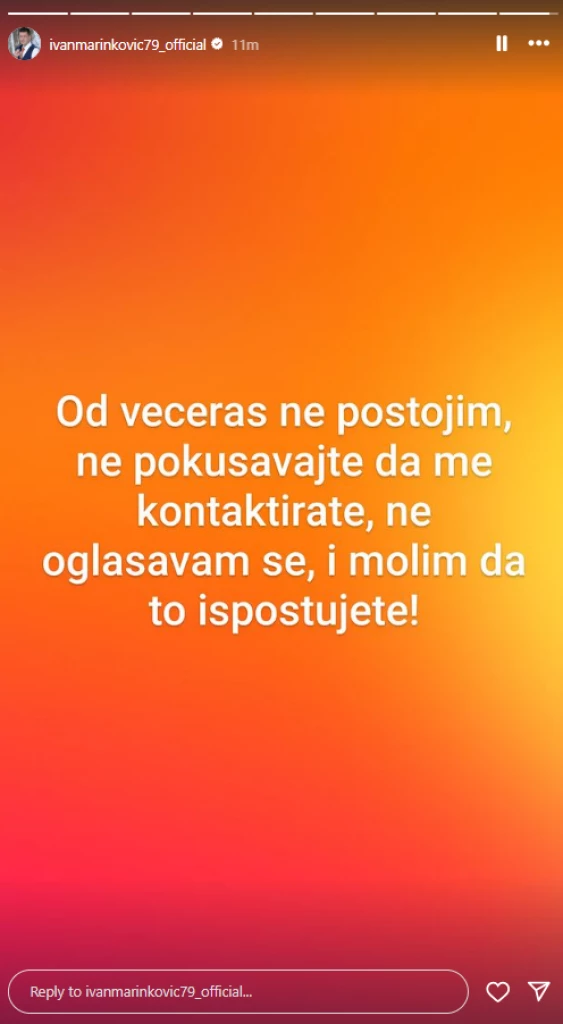 – Od večeras ne postojim! Ne pokušavajte da me kontaktirate, ne oglašavam se i molim vas da me ispoštujete – napisao je Marinković, a potom i nestao sa mreža.