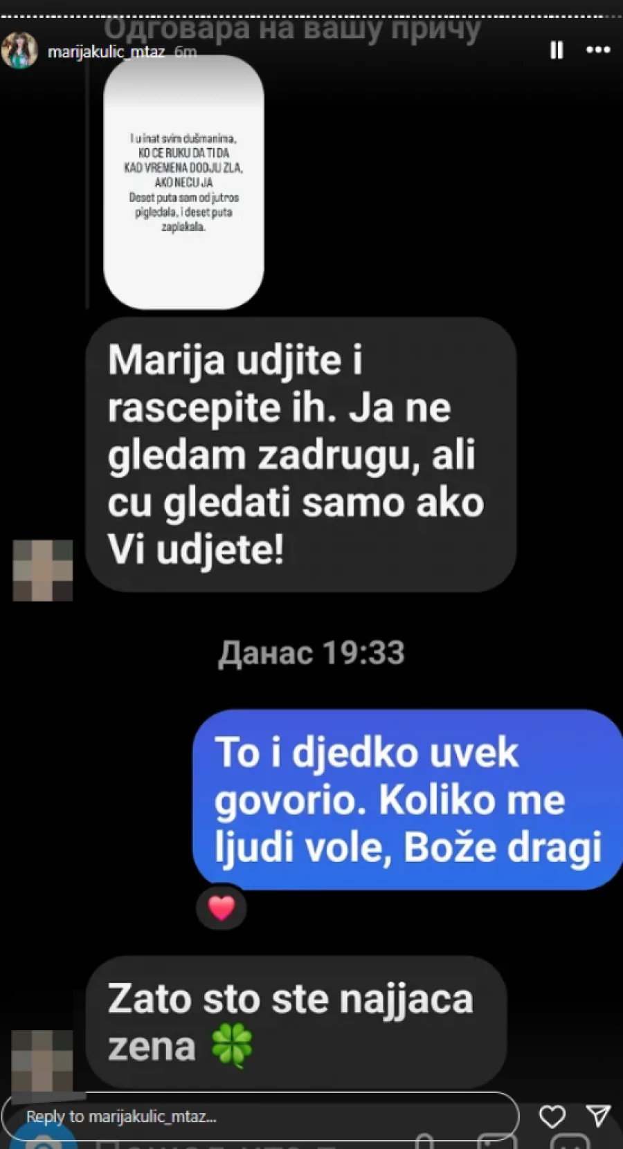 – Marija, uđite i raščepite ih. Ja ne mogu da gledam Zadrugu, ali ću gledati samo aku Vi uđete – bila je jedna u moru poruka slične sadržine, a posebno se istakla još jedna: