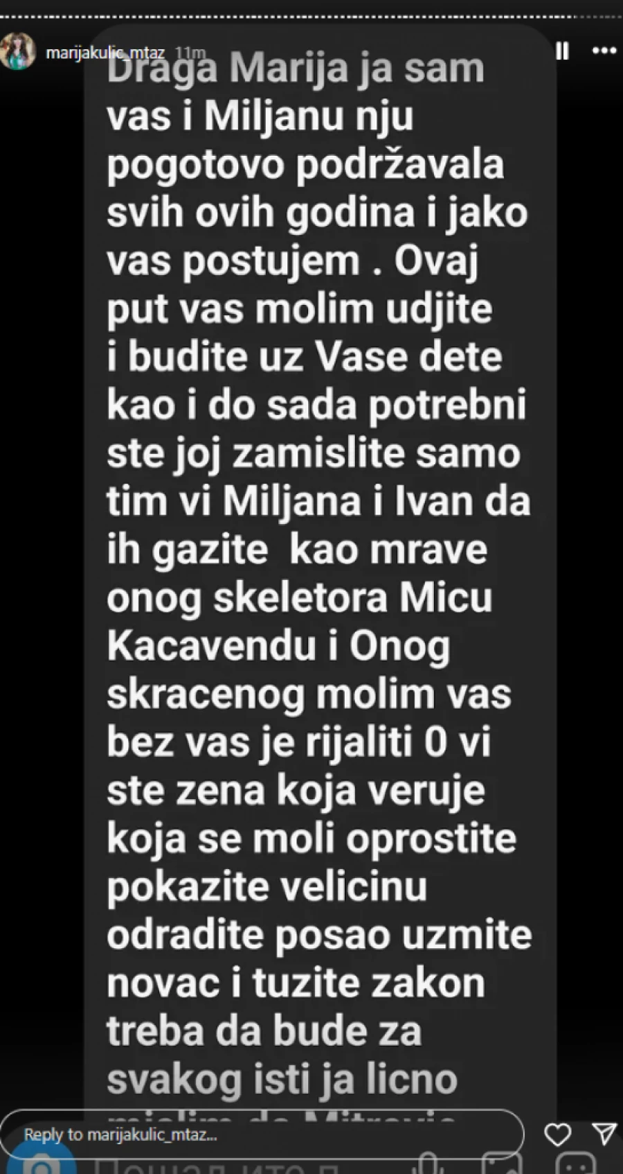 – Draga Marija, ja sam Vas i Miljanu, nju pogotovo, podržavala svih ovih godina i jako vas poštujem. Ovaj put Vas molim: uđite i budite uuz svoje dete, kao i do sada. Potrebni ste joj. Zamislite samo: tim Vi, Miljana i Ivan da ih gazite kao mrave – onog skeletora Miću, Kačavendu i onog Skraćenog. Molim Vas, bez Vas je rijaliti 0. Vi ste žena koja veruje, koja se moli, oprostite, pokažite veličinu. Odradite posao, uzmite novac i tužite – zakon treba da je za sve isti – stajalo je u drugoj molbi.