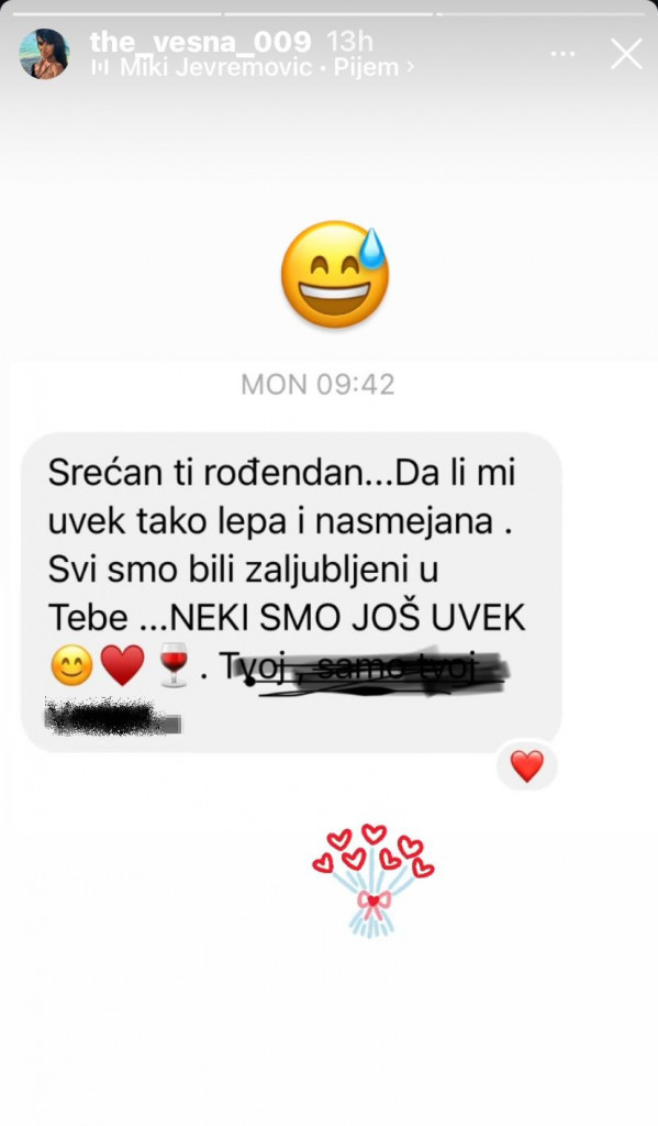 Srećan ti rođendan. Da si mi uvek tako lepa i nasmejana. Svi smo bili zaljubljeni u tebe… NEKI SMO JOŠ UVEK. Tvoj, samo tvoj – napisao je muškarac čije je ime ona zamračila. Ipak kako ovo “Tvoj, samo tvoj” nije uspela dovoljno da sakrije, mnogi su pomislili da iza poruke stoji niko drugi do sam Željko, čiji stihovi glase baš tako.
