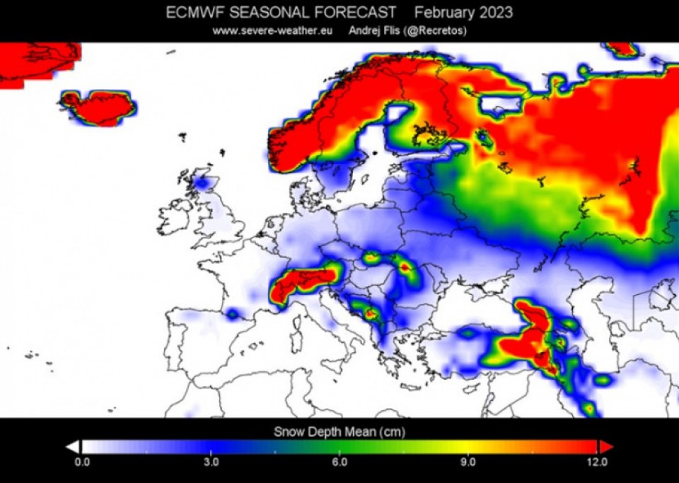 Što se tiče prognoze snježnih padavina, nad Evropom se bilježe prvenstveno ispodprosječne količine snijega. Fotografija iznad prikazuje prosječnu visinu snijega za februar, koja je posljednji zimski mjesec.