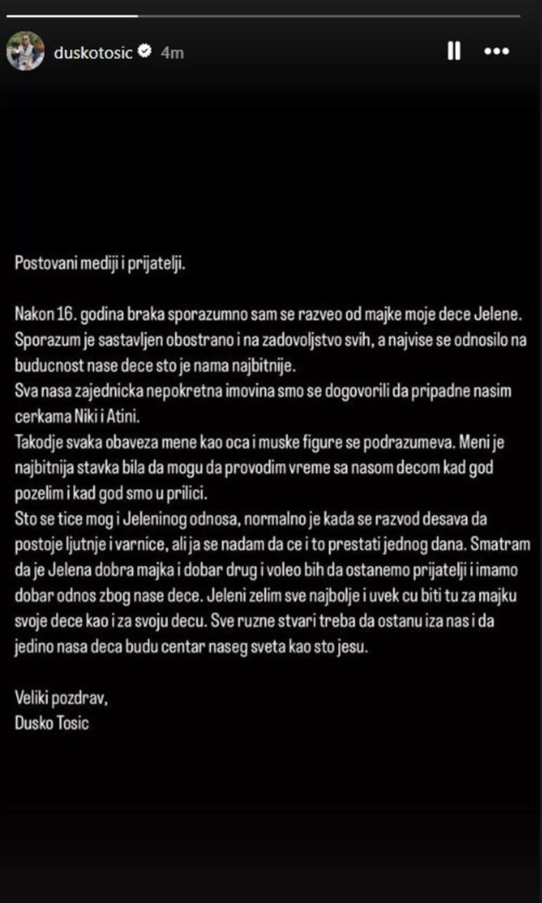 – Što se tiče Jeleninog i mog odnosa, normalno je kada se razvod dešava, da postoje ljutnje i varnice, ali ja se nadam da će i to prestati jednog dana. Smatram da je Jelena dobra majka i dobar drug i voleo bih da ostanemo prijatelji i da imamo dobar odnos zbog naše dece. Jeleni želim sve najbolje i uvek ću biti tu za majku svoje dece, kao i za svoju decu. Sve ružne stvari treba da ostanu izta nas i jedino naša deca treba da budu centar našeg sveta, kao što i jesu.