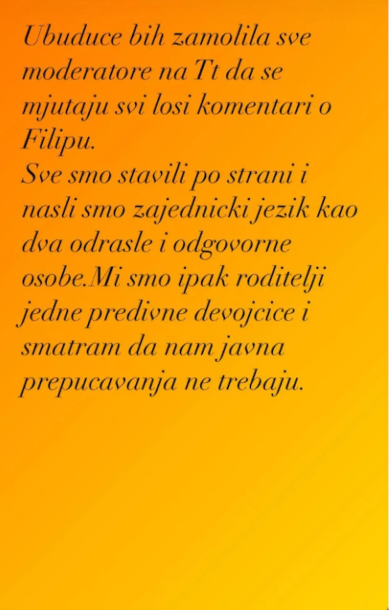 – Ubuduće bih zamolila sve moderatore na Tiktoku da se “mjutuju” svi loši komentari o Filipu. Sve smo stavili po strani i našli smo zajednički jezik kao dve odrasle i odgovorne osobe. Mi smo ipak roditelji jedne predivne devojčice i smtra da nam javna prepucavanja ne trebaju – napisala je Aleks u svojoj objavi nakon lajva.