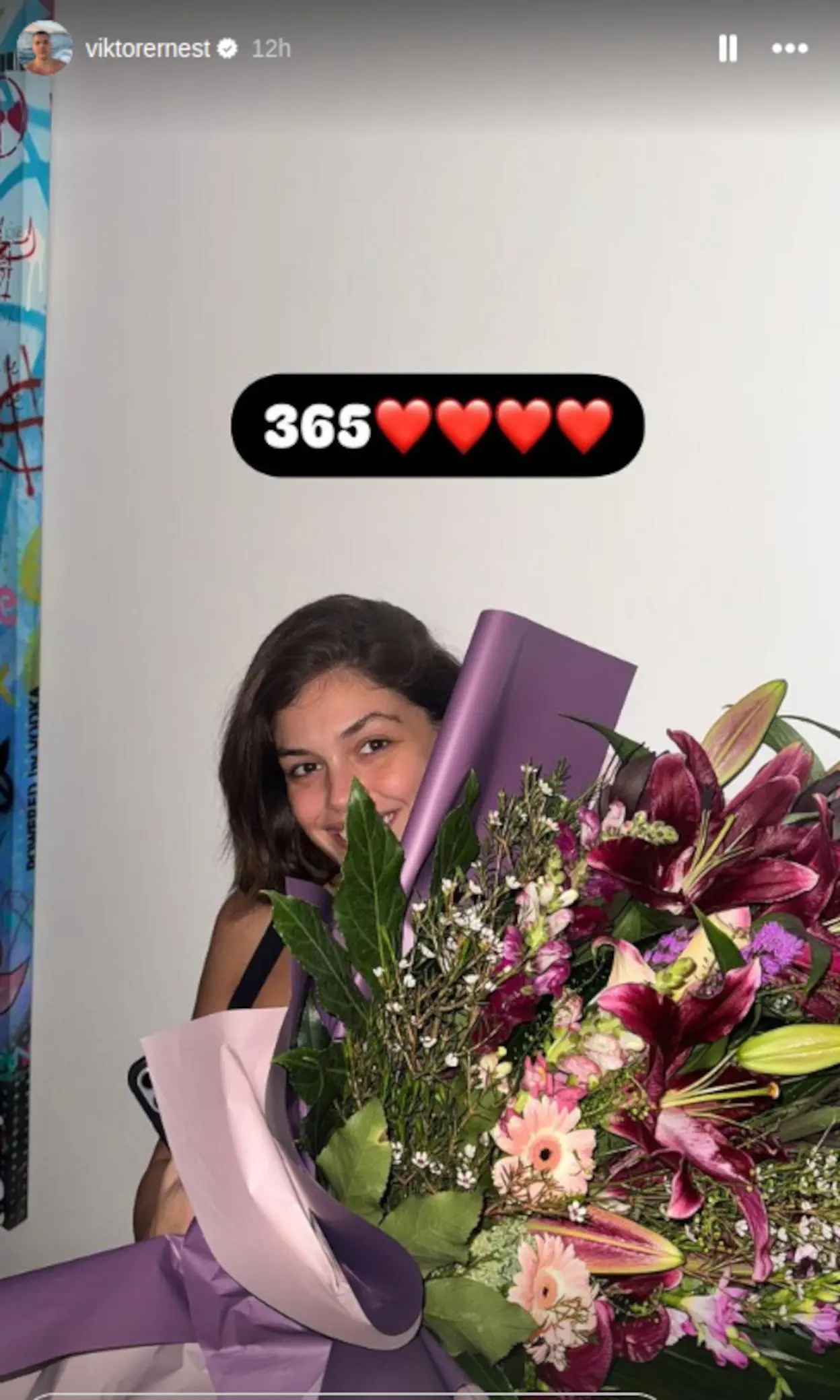 Povodom ovog značajnog datuma, Viktor je na društvenim mrežama podelio intiman trenutak – fotografiju Sofije s ogromnim buketom cveća, uz jednostavan opis: “365”, jasno aludirajući na godinu dana zajedništva.