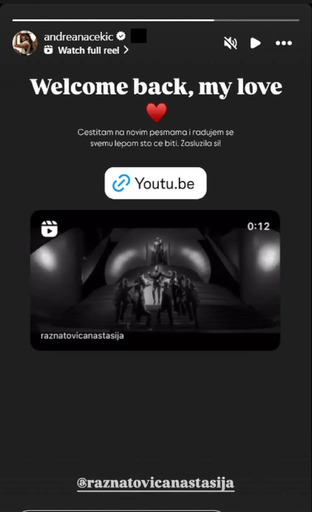 – Welcome back, my love (dobro došla nazad, moja ljubavi). Čestitam na novim pesmama i radujem se svemu lepom što će biti. Zaslužila si! – napisala je Adreana uz emotikone srca.