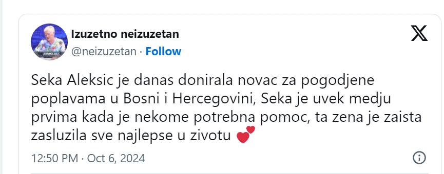 – Seka Aleksić je danas donirala novac za pogođene poplavama u Bosni i Hercegovini. Uvek je među prvima kada je nekome potrebna pomoć, ta žena je zaista zaslužila sve najlepše u životu.
