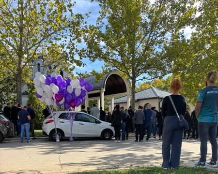 Povorka je krenula oko 13.20, a kako javlja naš reporter, na groblju je sablasna tišina, a čuju se samo jecaji. Pored belog kovčega zakačeni su ljubičasto-beli baloni.