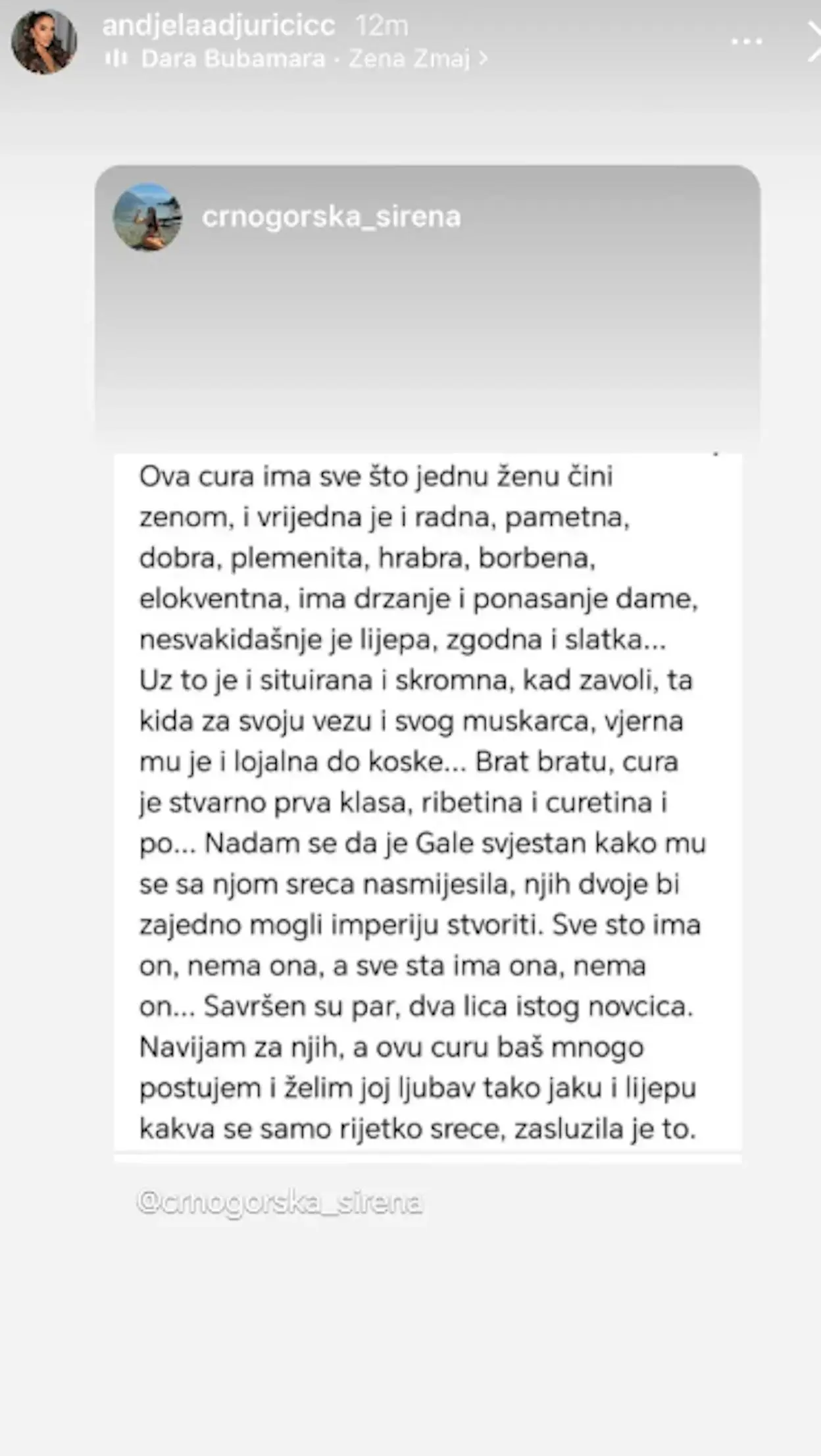 – Ova cura ima sve što jednu ženu čini ženom i vredna je i radna, pametna, dobra, plemenita, hrabra, borbena, elokventna, ima držanje i ponašanje dame, nesvakidašnje je lepa, zgodna i slatka….Uz to je i situirana i skromna, kad zavoli, ta kida za svoju vezu i svog muškarca, verna mu je i lojalna do koske…Brat bratu, cura je stvarno prva klasa, ribetina i curetina i po…Nadam se da je Gale svestan kako mu se sa njom sreća nasmešila, njih dvoje bi zajedno mogli imperiju stvoriti. Sve što ima on, nema ona, a sve što ima ona, nema on. Savršen su par, dva lica istog novčića. Navijam za njih, a ovu curu baš mnogo poštujem i želim joj ljubav tako jaku i lepu kakva se samo retko sreće, zaslužila je to – napisala je izvesna instagram stranica, koja nosi naziv “crnogorska sirena”, što je Anđelina podrška, koja joj vodi instagram profil dok je ona u “Eliti 8” podelila, te se tako može pretpostaviti da su saglasni s ovim rečima.