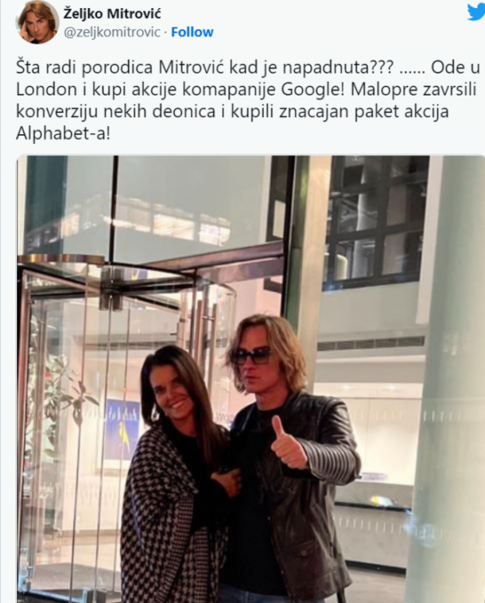 – Šta radi porodica Mitrović kad je n…a? Ode u London i kupi akcije komapanije Google! Maloprije završili konverziju nekih dionica i kupili značajan paket akcija Alphabet-a – napisao je Željko.