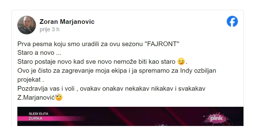 – Prva pesma koju smo uradili za ovu sezonu ”Fajront”. Staro a novo … Staro postaje novo kad sve novo ne može biti kao staro. Ovo je čisto za zagrevanje, moja ekipa i ja spremamo za Indy ozbiljan projekat . Pozdravlja vas i voli, ovakav, onakav, nekakav, nikakav i svakakav Z. Marjanović – napisao je Zoran.