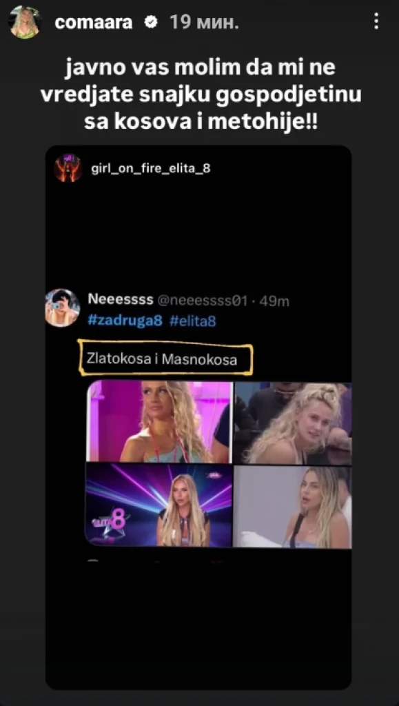 – Javno vas molim da mi ne vređate snajku gospođetinu sa Kosova i Metohije – napisala je Milica uz skrinšot objave sa društvene mreže “Iks”, gde su uporedili njene i Sofijine slikama, ali i nadimke koje su im dodelili – masnokosa i zlatokosa.