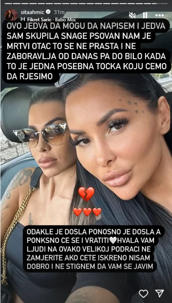 Na to nije ostala imuna ni njena sestra Sita Ahmić, koja se oglasila putem storija na svom Instagram profilu i poručila da se ne oseća dobro, te da će to rešiti na svoj način.