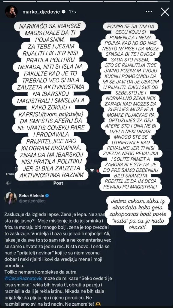 Međutim, tu se situacija nije stišala, već je objavila status na ,,X” društvenoj mreži, u kom je između ostalog Marka Đedovića nazvala ,,neki rijaliti lik”. On je odlučio da Seki odgovori u žestok stilu, te je na Instagram profilu objavio status, koji prenosimo u nastavku teksta: