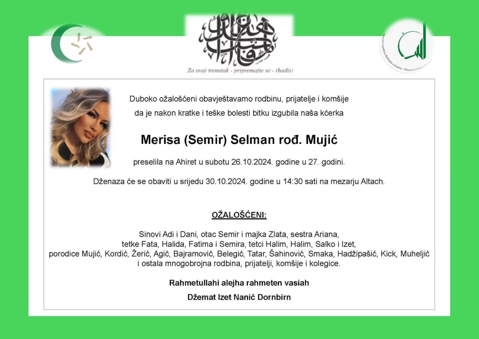 Bitku za život nije uspjela dobiti, a na smrtovnici stoji: “Naša kćerka Merisa (Semir) Selman rođ. Mujić preselila na Ahiret u subotu 26.10.2024. godine u 27. godini.”