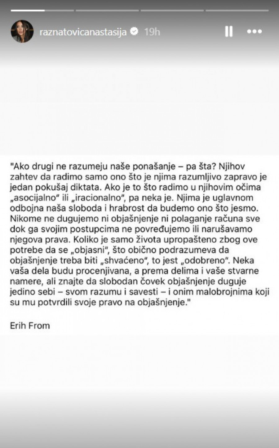 Ova objava Anastasije Ražnatović navela je mnoge da se zapitaju šta se krije između redova, šta je pevačica, tačnije kome je želela ovo da poruči?