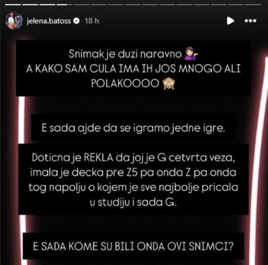 – Snimak je duži naravno! A kako sam čula ima ih još mnogo, ali polako! E, sada ajde da se igramo jedne igre. Dotičan je rekla da joj je Gastoz četvrta veza, imala je dečka pre Zadruge 5, pa onda Zvezdana, pa onda tog napolju o kojem je najbolje pričala u studiju i sada Gastoza. E, sada kome su bili onda ovi snimci?