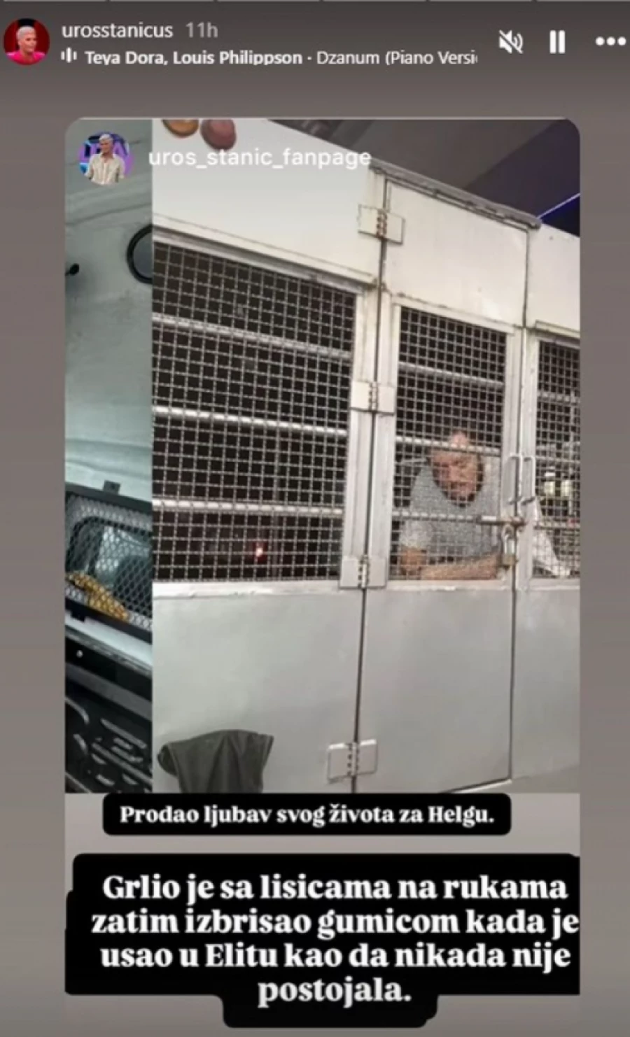 – Prodao ljubav svog života za Helgu. Grlio je sa lisicama na rukama, zatim je izbrisao gumicom kada je ušao u Elitu kao da nikada nije postojala – napisano je preko objave.