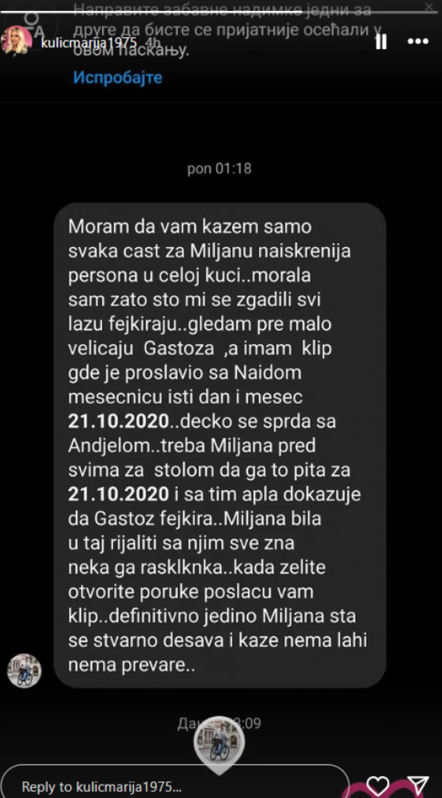 – Moram da kažem samo svaka čast Miljani, najiskrenija persona u celoj kući… morala sam da kažem zato što su mi se svi zgadili, svi lažu, fejkiraju… gledam malopre, veličaju Gastoza, a imam klip gde je slavio sa Naidom mesečnicu, isti dan i mesec! 21.10.2020. dečko se sprda sa Anđelom! treba Miljana pres svima za stolom da ga pita za 21.10.2020. i sa tim da dokaže da Gastoz fejkira. Miljana je bila sa njim u tom rijalitiju, sve zna! Neka ga raskrinka! Kada želite, otvorite poruke, polsaću vam klip. Definitivno jedino Miljana zna šta se stvarno dešava i kaže! Nema laži, nema prevare – glasila je poruka.