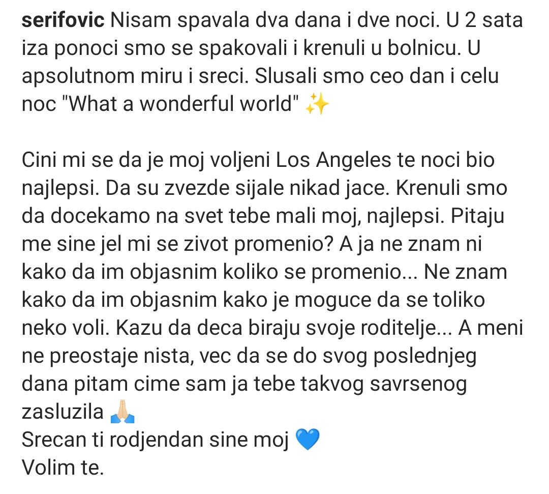 Marija je zaključila da djeca biraju svoje roditelje, zahvalivši se svom sinu što ju je izabrao. „Čime sam ja tebe, takvog savršenog, zaslužila?“ pitala je na kraju objave, uz čestitku povodom njegovog rođendana.