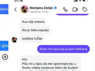 – Ma, ja nemam pojma, prvi put je vidim. Bože sačuvaj! Ja nisam tamo išla gde je ona bila, sigurno. Au, nije svesna šta je čeka napolju, ozbiljne tužbe. Pišu mi u lajvu da me spominje, ja nju u životu videla nisam. Šta je tačno rekla za mene? Da zovem sutra advokata? – pisala je Marijana, dok se Sanja iščuđavala zbog Sofijinih navoda.