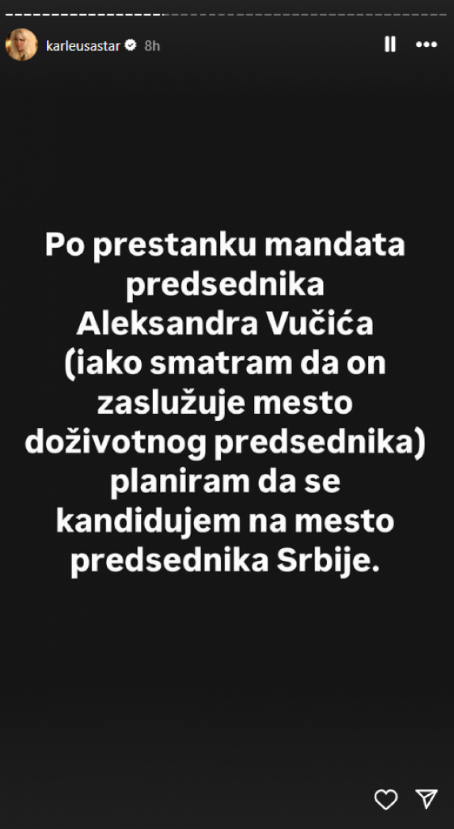 Poznata pevačica Jelena Karleuša nedavno je iznenadila javnost kada je otkrila da planira da se kandiduje za predsednika Srbije nakon isteka mandata sadašnjeg predsednika. Ova vest izazvala je veliku pažnju javnosti, a Jelena je jasno naglasila da ima ambiciju da preuzme ovu važnu poziciju.