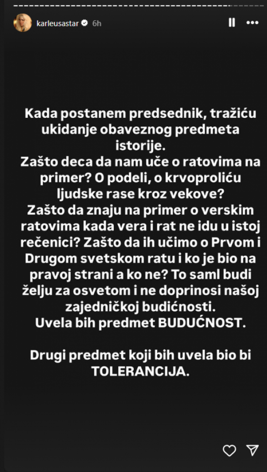 – Zada postanem predsednik, tražiću ukidanje obaveznog predmeta istorije. Zašto deca da nam uče o ratovima, na primer? O podeli, o krvoproliću ljudske rase kroz vekove? Zašto da znaju na primer o verskim ratovima kada vera i rat ne idu i istoj rečenici? Zašto da ih učimo o Prvom i Drugom svetskom ratu i ko je bio na pravoj strani a ko ne? To samo budi želju za osvetom i ne doprinosi našoj zajedničkoj budućnosti. Uvela bih predmet budućnost. Drugi predmet koji bih uvela bio bi tolerancija – napisala je Karleuša