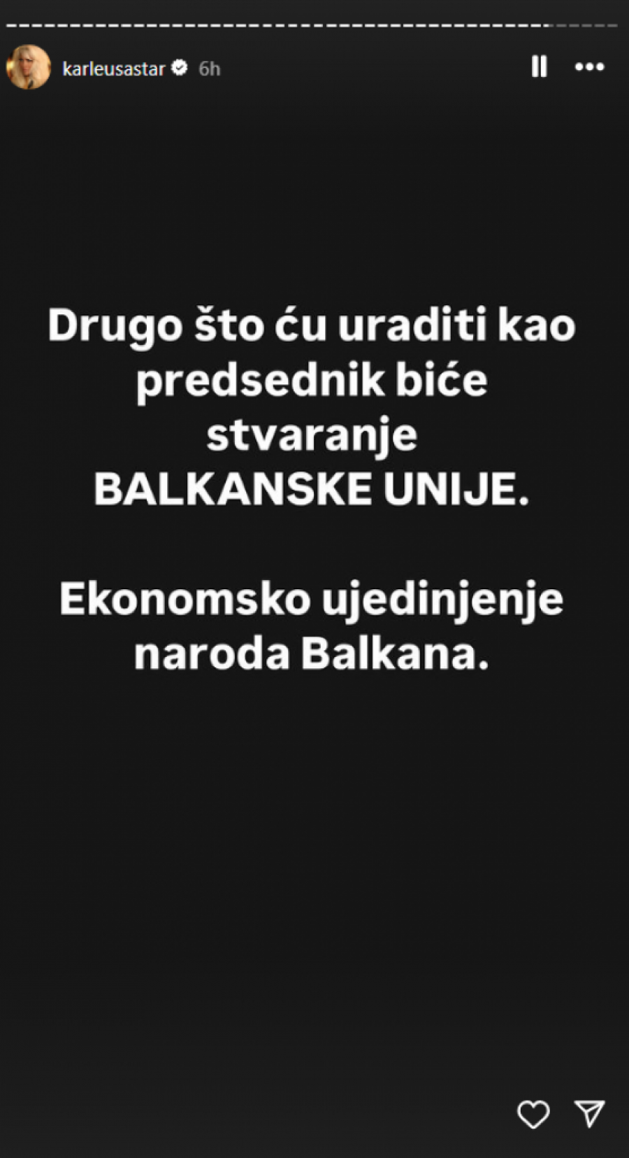 – Drugo što ću uraditi kao predsednik biće stvaranje Balkanske unije. Ekonomsko ujedinjenje naroda Balkana – dodala je pevačica.