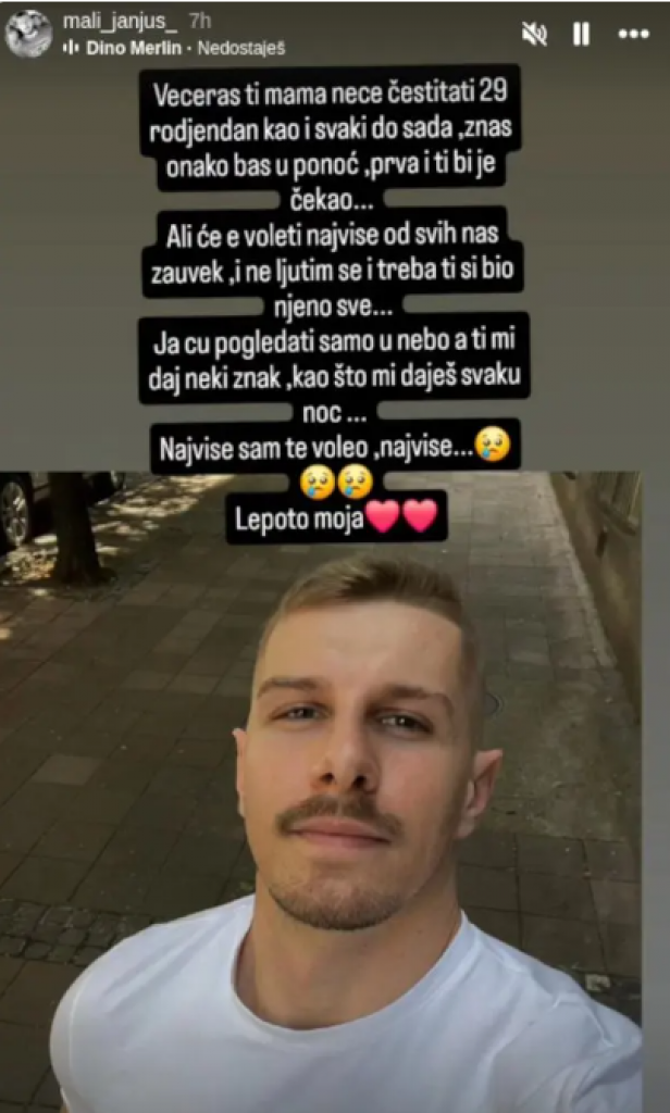 Večeras ti mama neće čestitati 29. rođendan kao i svaki do sada, znaš baš onako u ponoć, prva i ti bi je čekao. Ali će te voleti najviše od svih nas zauvek, i ne ljutim se, i treba – ti si bio njeno sve. Ja ću pogledati samo u nebo a ti mi daj neki znak, kao što mi daješ svaku noć… Najviše sam te voleo, najviše… Lepoto moja – napisao je Marko na fotografiji svog najmlađeg brata.
