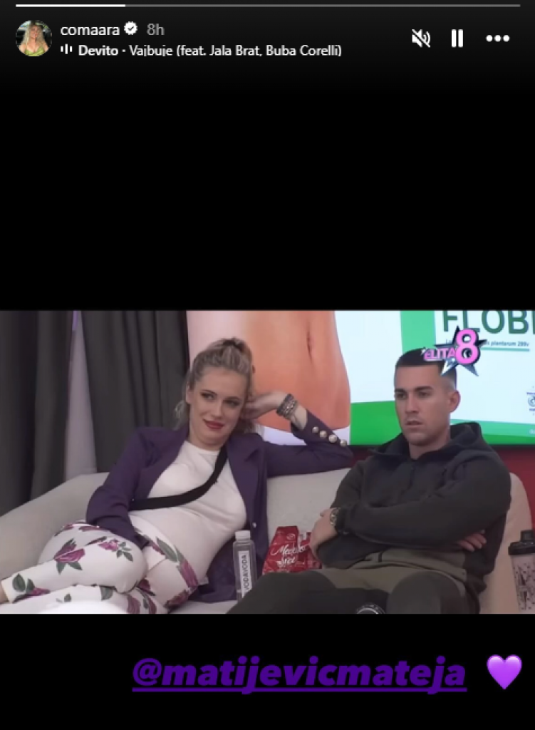 Trudna Milica Veličković nedavno je napustila “Elitu 8”, a kasno sinoć se oglasila i objavila fotku iz rijalitija. Na njoj se vidi ona, koja sedi pored Mateje Matijevića, čiji je profil označila i dodala emotikon ljubičastog srca. Preko objave Milica je stavila i pesmu “Vajbuje”, koju izvodi Devito.