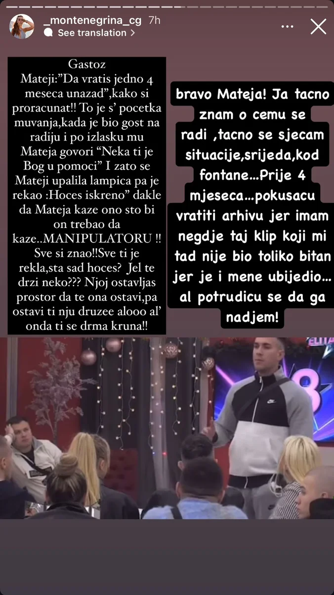 Gastoz Mateji: “Da vratiš jedno četiri meseca unazad”, kako si proračunat! To je s početka muvanja kad je bio gost u radiju i po izlasku mu Mateja govori: “Neka ti je Bog u pomoći”. I zato se Mateji upalila lampica, pa je rekao: “Hoćeš iskreno?”, dakle da Mateja kaže ono što bi on trebao da kaže… Manipulatoru! Sve si znao! Sve ti je rekla, šta sad hoćeš? Je l’ te drži neko? Njoj ostavljaš prostor da te ona ostavi, pa ostavi ti nju druže, ali onda ti se drma kruna – glasila je poruka na profilu Anđeline podrške, koja se takođe složila sa rečima Mateje Matijevića: