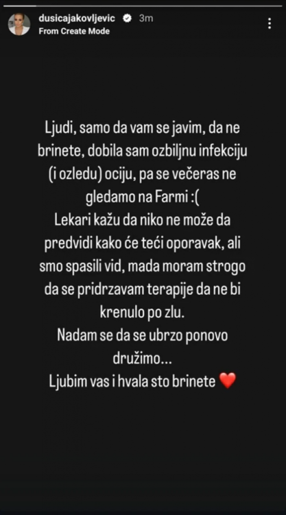 – Ljudi, samo da vam se javim, da ne brinete, dobila sam ozbiljnu infekciju i povredu očiju, pa se večeras ne gledamo na “Farmi” – napisala je Jakovljevićeva u svojoj iznenadnoj objavi, te nastavila: