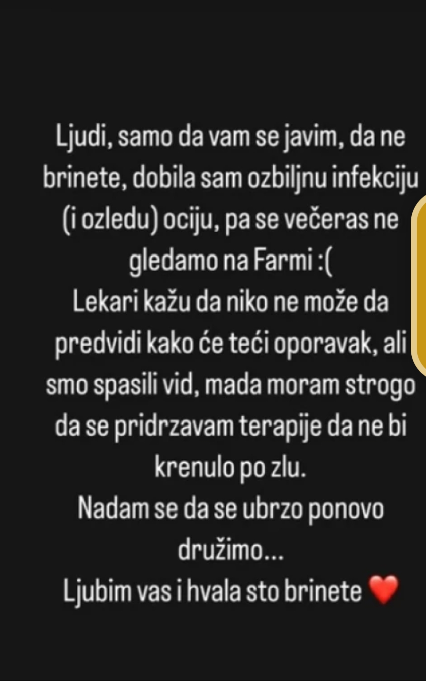 Ljudi, samo da vam se javim, da ne brinete, dobila sam ozbiljnu infekciju i povredu očiju, pa se večeras ne gledamo na “Farmi” napisala je Jakovljevićeva u svojoj iznenadnoj objavi, te nastavila: