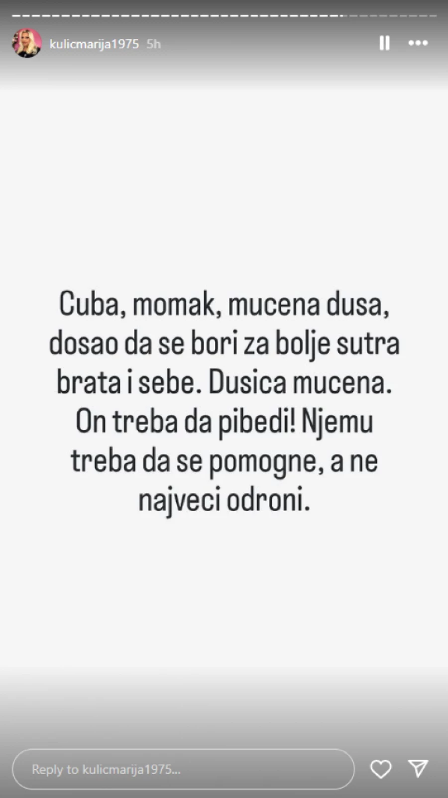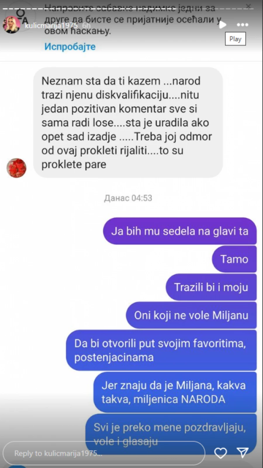 – Ne znam šta da ti kažem. Narod traži njenu diskvalifikaciju. Niti jedan pozitivan komentar, sve sama sebi radi loše. Šta je uradila ako opet sad izađe? Treba joj odmor od ovog rijalitija. To su proklete pare – napisala je jedna osoba, a Marija je odgovorila: